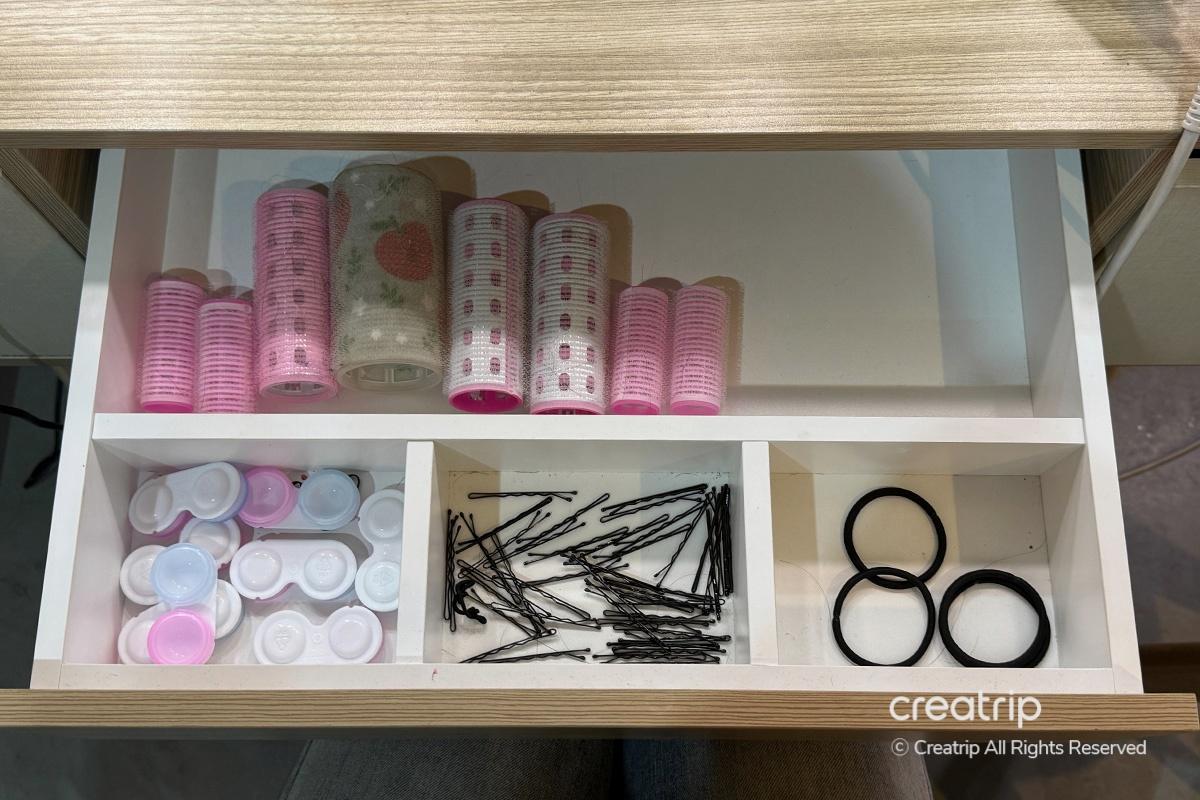 而且打開桌子抽屜一看,劉海卷、鏡片盒、髮夾、發繩等一一細心擺放,讓人覺得"哇,真的很有Sense!"