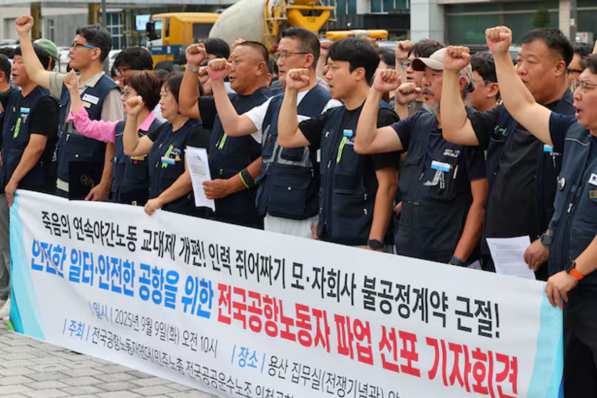 由民主勞總公共運輸工會仁川機場地區支部同全國機場工會組成嘅「全國機場工人聯合會」9月9號喺首爾龍山總統辦公室前舉行記者會,正式宣佈即將罷工,訴求包括改善輪班制度、增聘人手、取消不公平合約同改革低薪結構等。