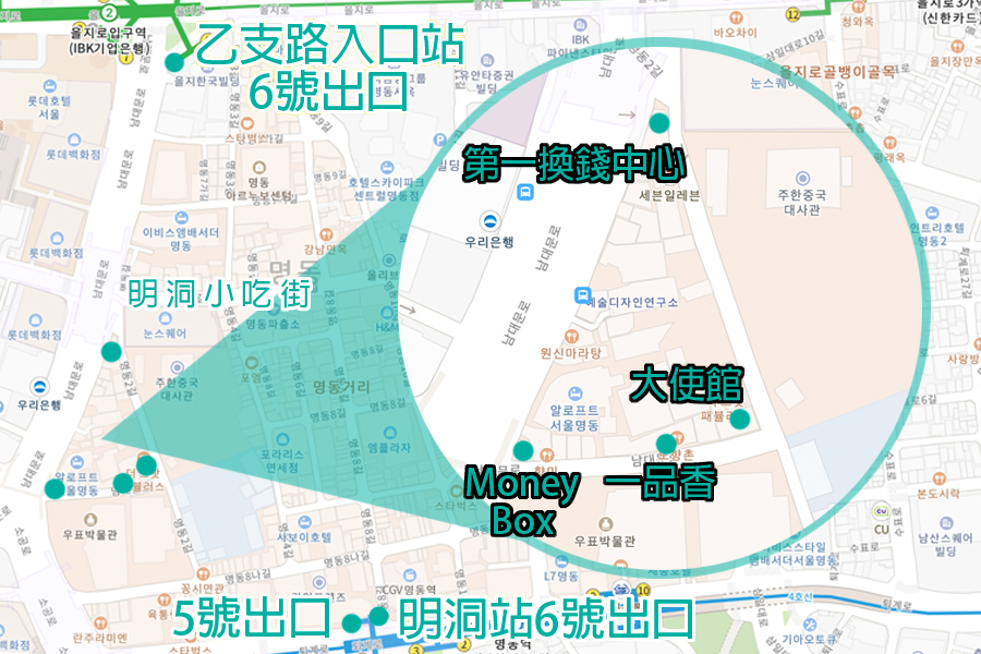 其實明洞匯率最好嘅找換店都係喺附近,由乙支路入口站6號出口、明洞站5號出口、7號出口行過去都好近。