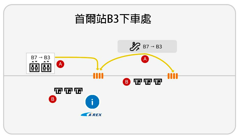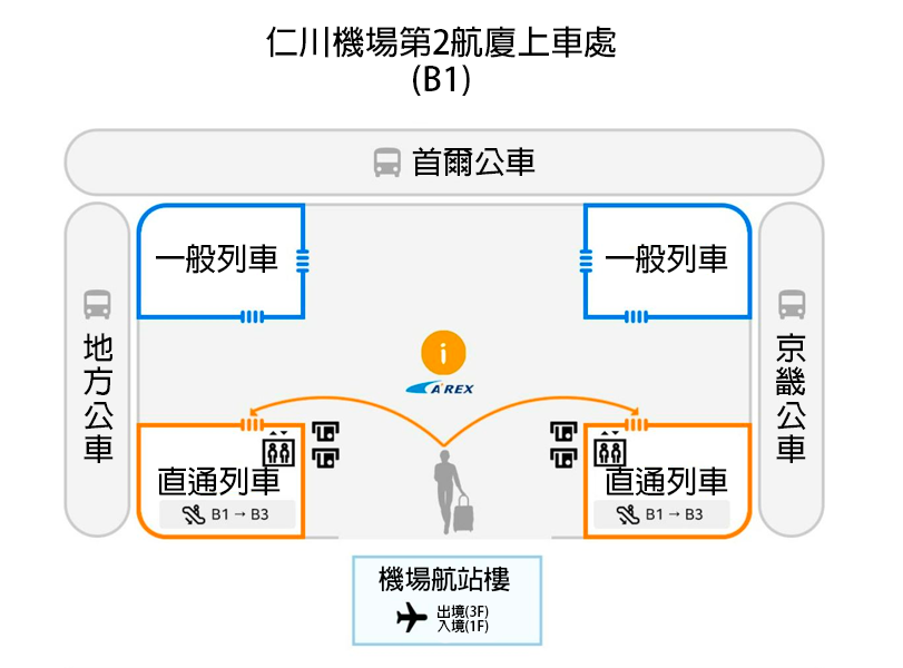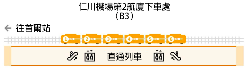 - 如果喺仁川機場T2搭AREX,請喺B1入閘後搭電梯落B3上車