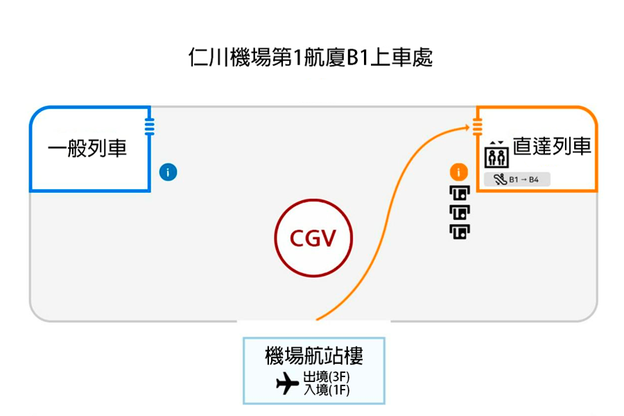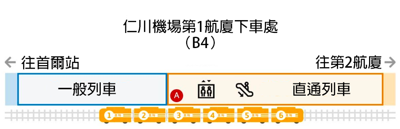 - 如果喺仁川機場T1搭AREX,請喺B1入閘後搭電梯落B4上車