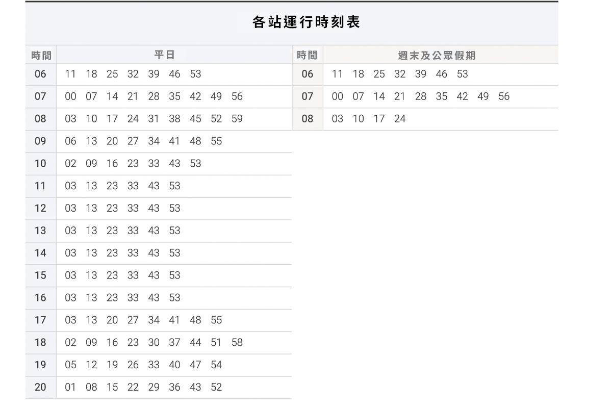 平日 | 週末及公眾假期 (平日07:00-09:00) | 平日 | 週末及公眾假期 (平日07:00-09:00) | |