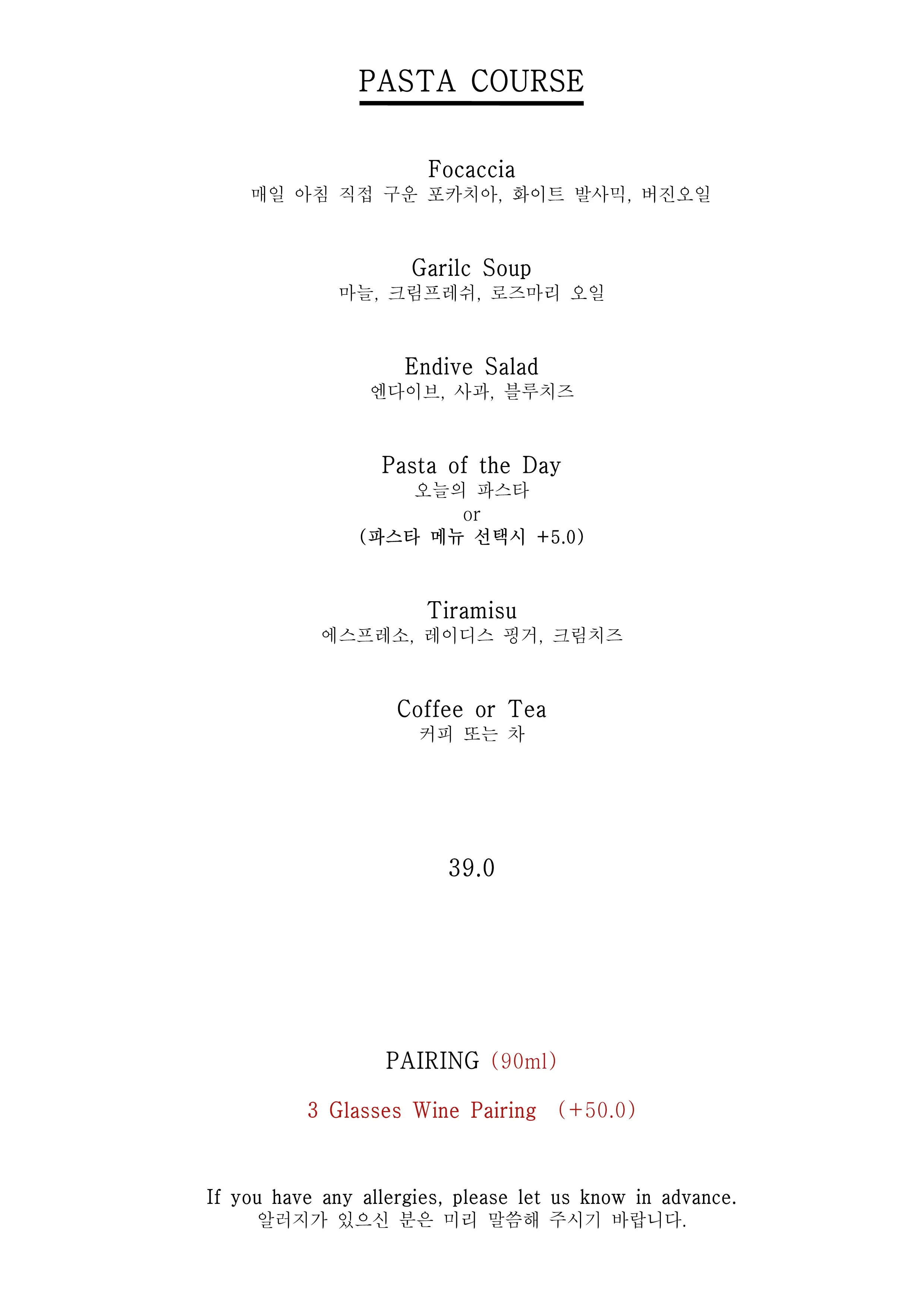 Focaccia意式麵包 香蒜濃湯 苦苣沙律 是日意粉 Tiramisu 咖啡或茶 ※額外加購推薦紅酒 |