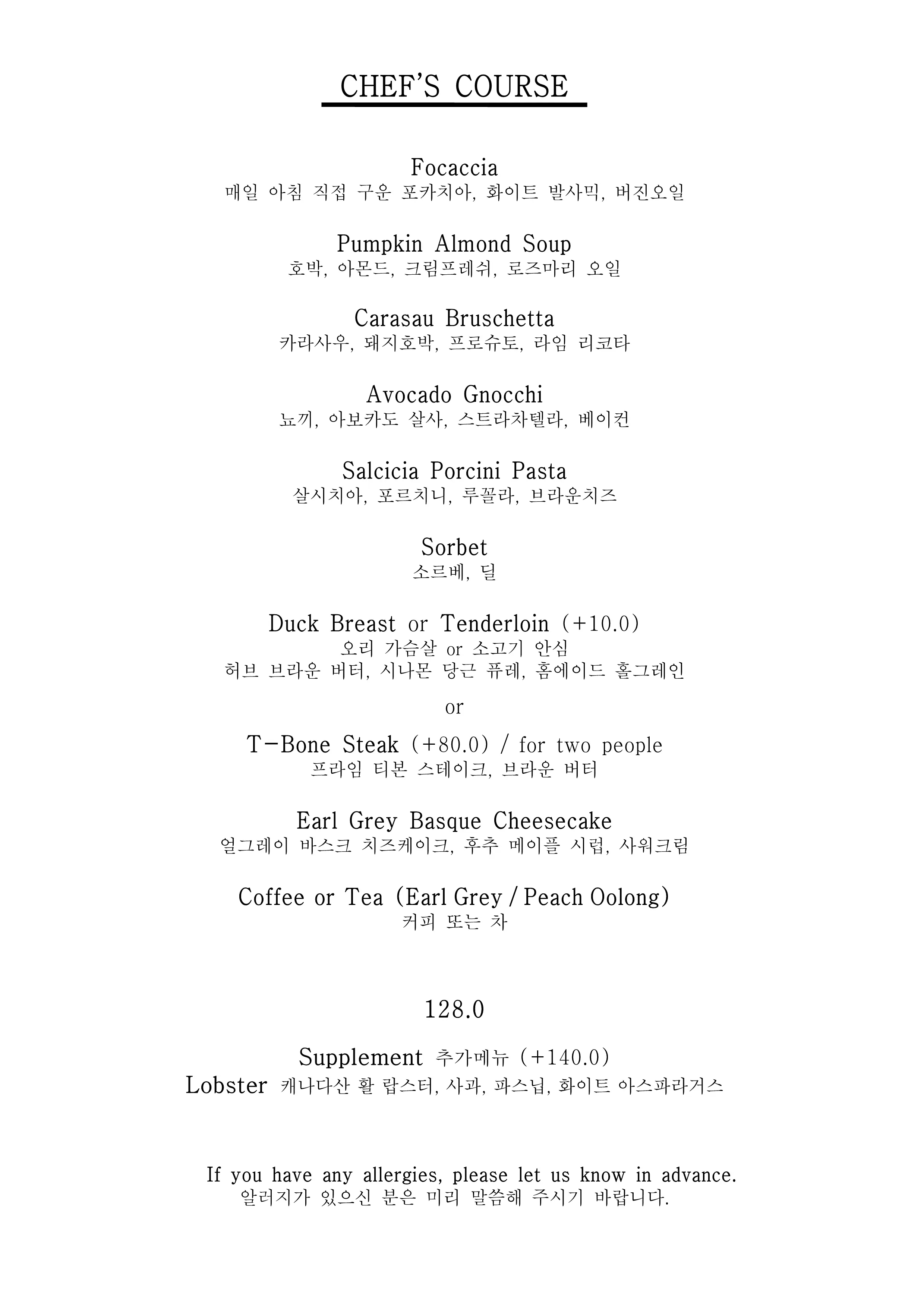 Focaccia意式麵包 南瓜杏仁濃湯 意式烤麵包 牛油果Gnocchi 意大利莎樂美腸牛肝菌意粉 雪葩 香煎鴨胸 or 菲力牛扒(+₩10,000/人) 伯爵茶巴斯克焦香芝士蛋糕 咖啡或茶(伯爵茶/蜜桃烏龍茶) ※額外加購西式龍蝦料理(+₩140,000) |