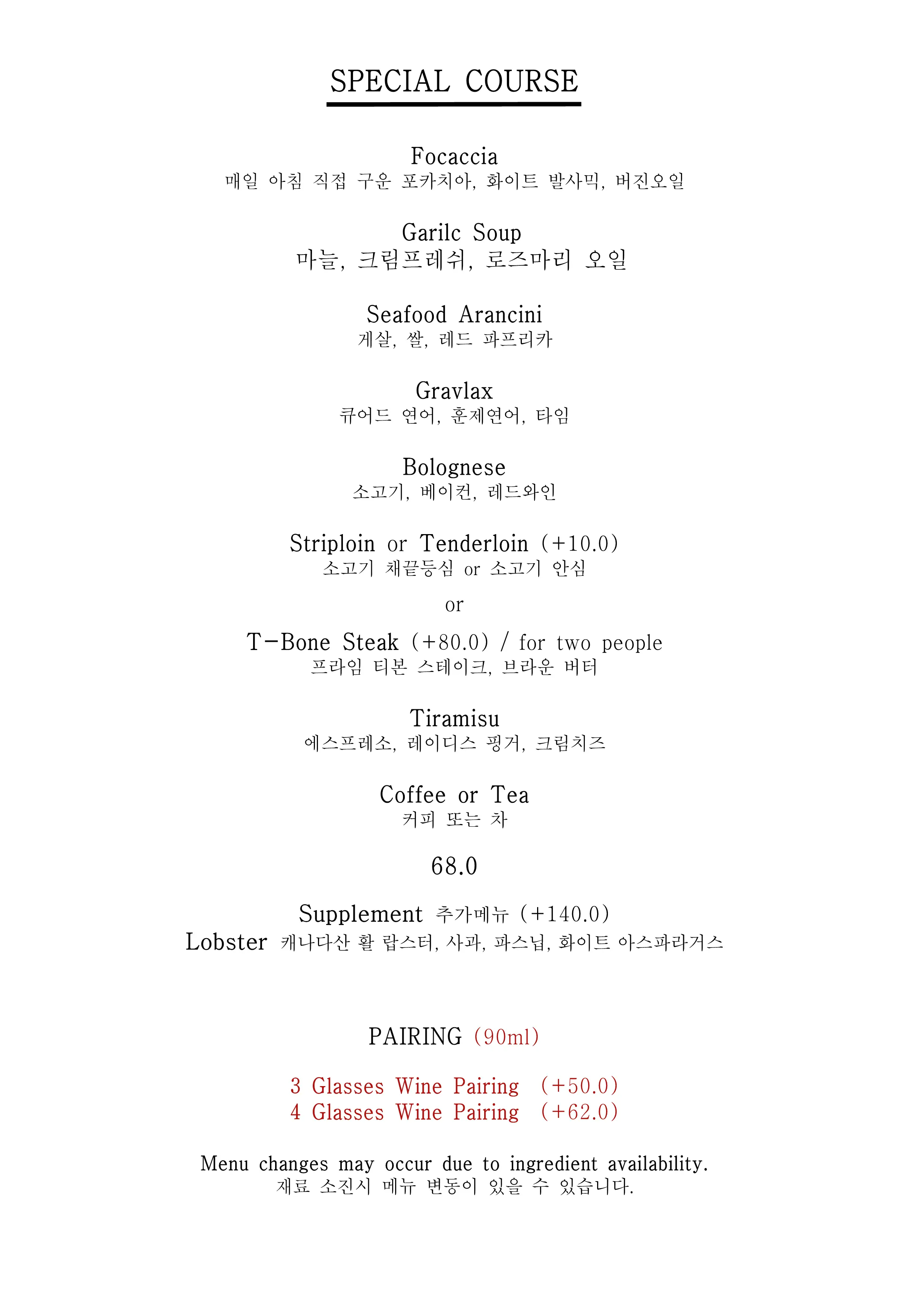 Focaccia意式麵包 香蒜濃湯 海鮮意大利炸飯糰 醃三文魚 肉醬意粉 西冷牛扒 or 菲力牛扒(+₩10,000/人) Tiramisu 咖啡或茶 ※額外加購西式龍蝦料理(+₩140,000) ※額外加購推薦紅酒 |