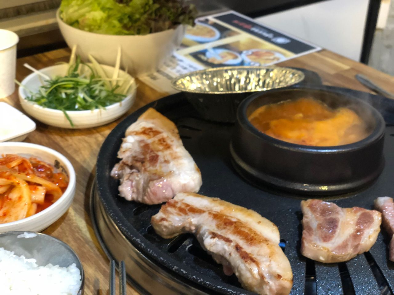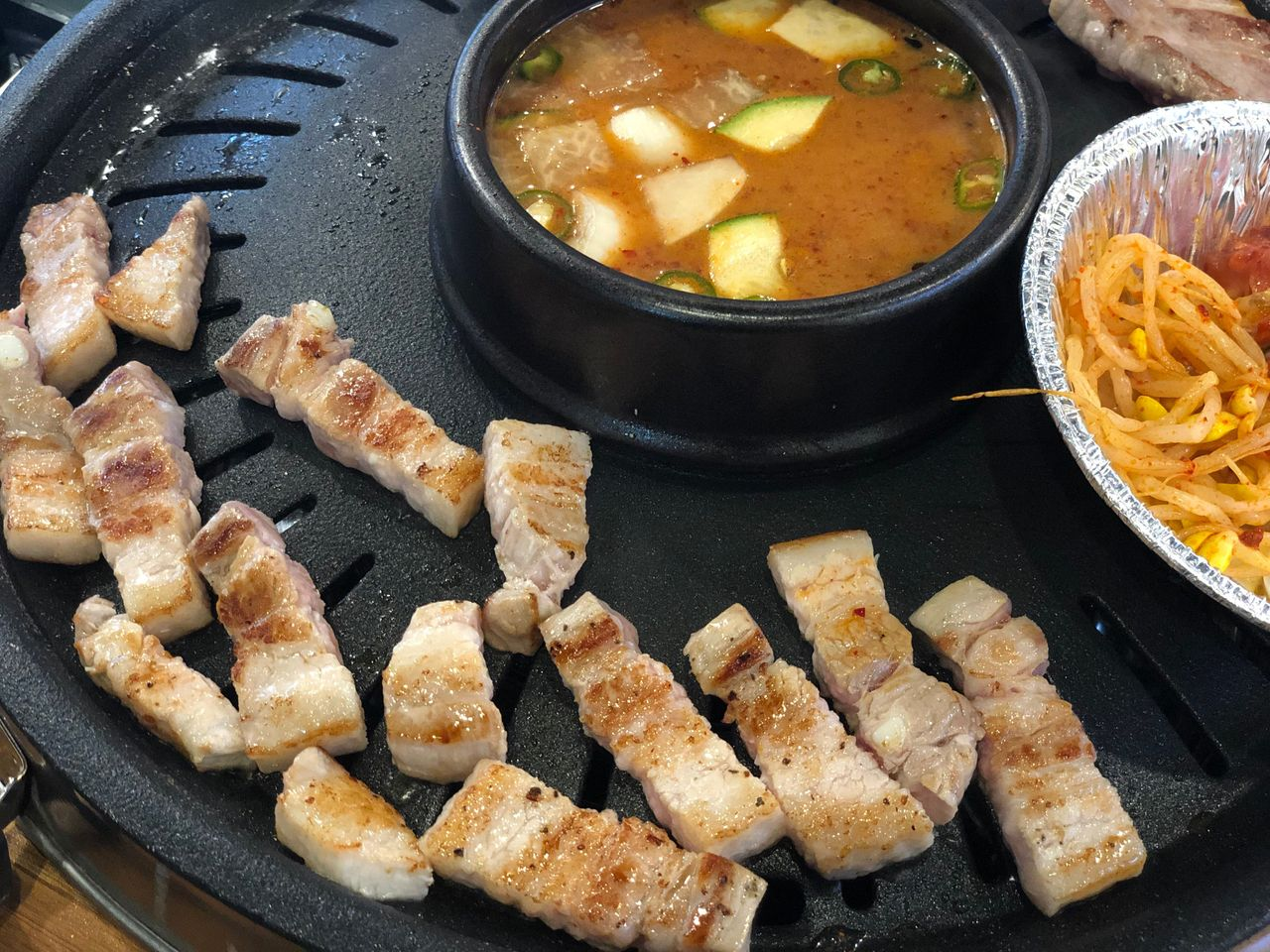 五花肉喺鐵板上面燒到金黃色,逼啲油出嚟之後加麻油、辣醬,包埋生菜入面一啖食,完美!