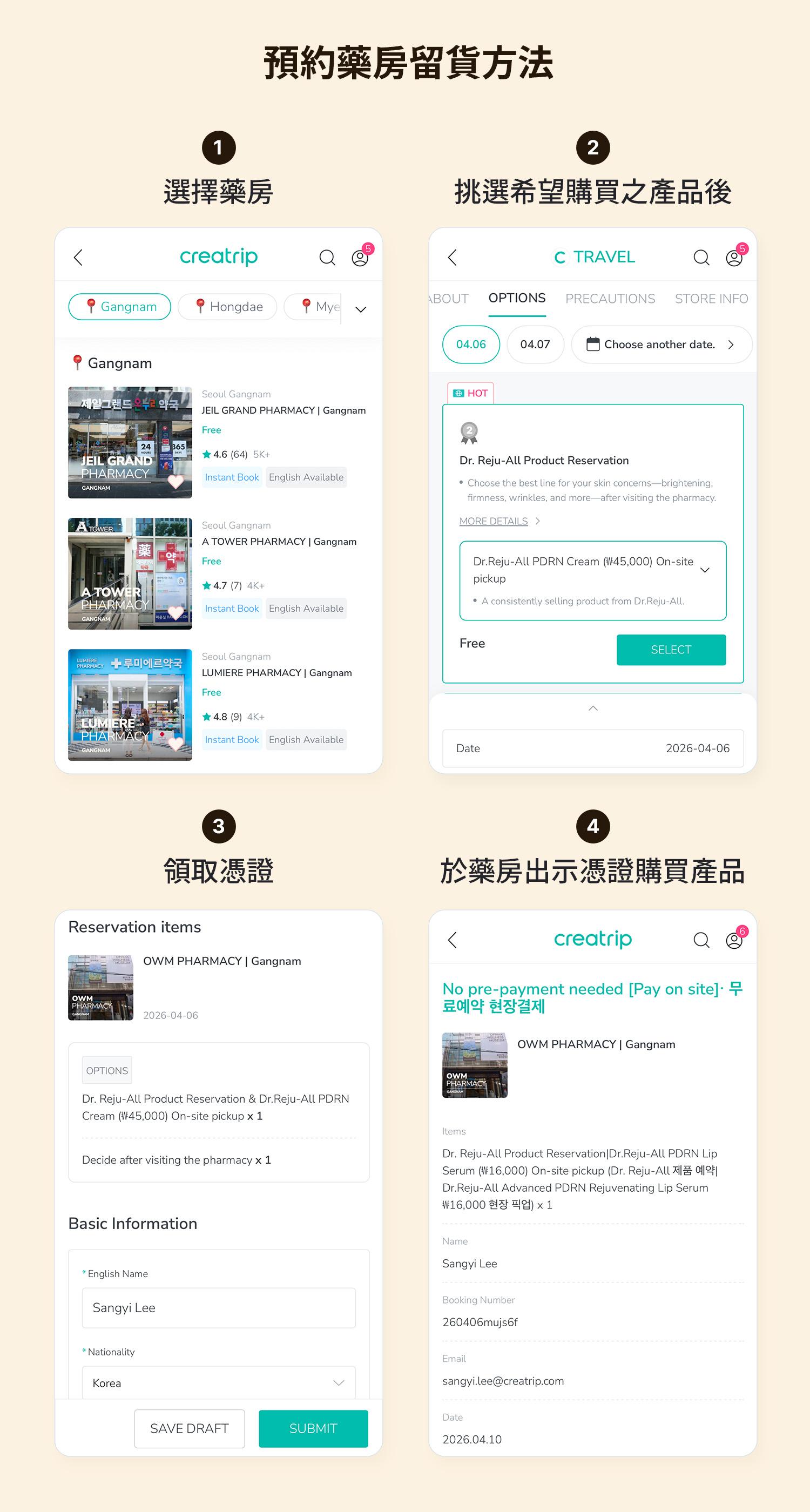 免付訂金即可預約韓國最熱賣嘅Dr.Reju-All PDRN面霜,到藥房現場購買。可以先諮詢再決定,零負擔!Creatrip合作藥房仲有PDRN面膜、唇部精華、Rejuran、Melatoning面霜等K-beauty人氣產品等緊你體驗。