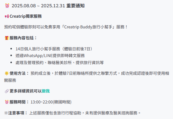 另外,預約指定合作醫美診所,仲可以免費享有14日Creatrip Buddy旅行小幫手服務,任何關於韓國旅遊嘅問題或者諮詢,都有人工小幫手即時幫你解答。