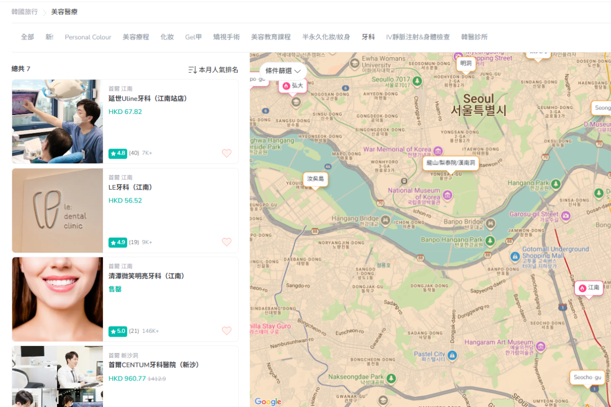 唔單止有醫美療程,韓國牙科、眼科,仲有近年嚟韓必做嘅美容行程,好似美髮、Personal Colour、韓星指定妝髮Studio、Spa等等,全部都按地區分類好晒,熱門地區例如弘大、明洞、江南等應有盡有。