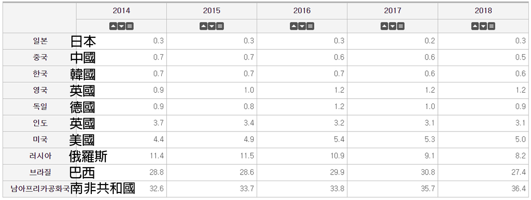以2018年為基準嚟講,韓國嘅殺人比例約0.6,算係低於日本與中國。