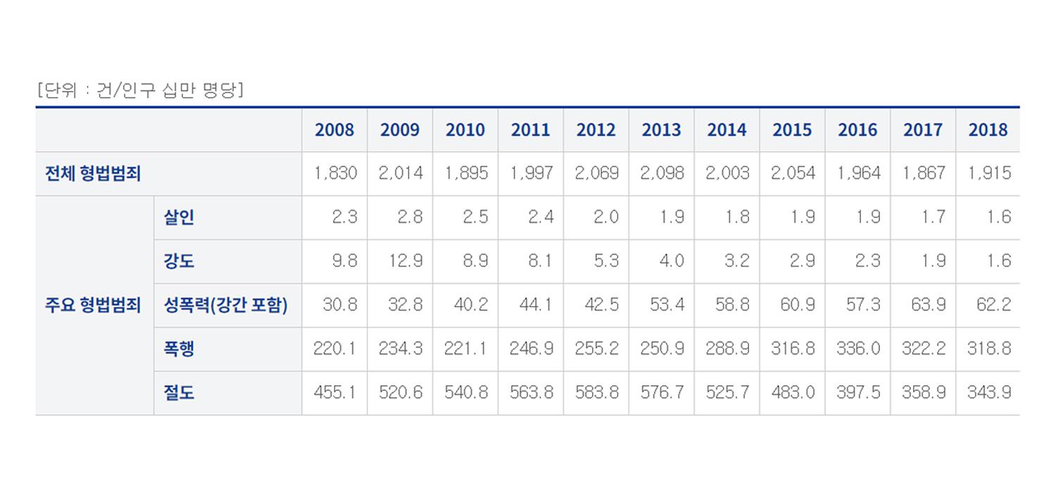 呢個數字其實喺1980年代開始增加,近30年裡面,韓國嘅犯罪率增長咗兩倍以上:1981年有935單;1991年雖然減少至558單,但直到2018年為止竟然增加至1,915單,姐係話10萬人裡面就會有接近2000人犯罪。