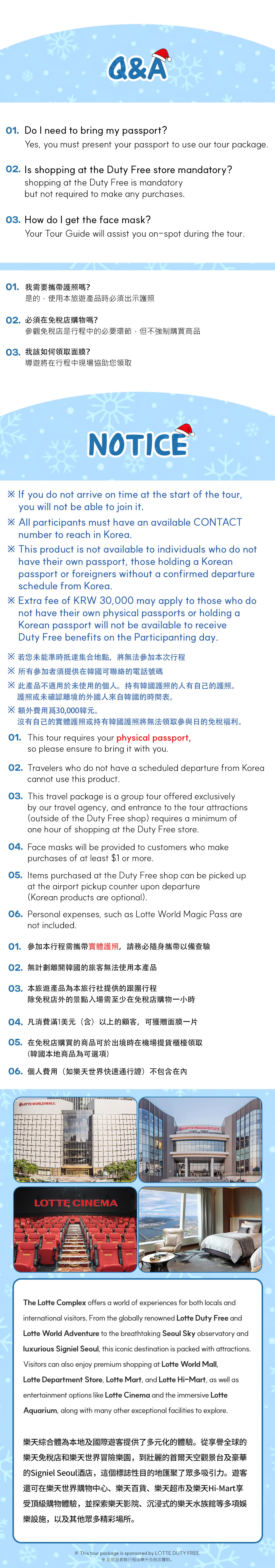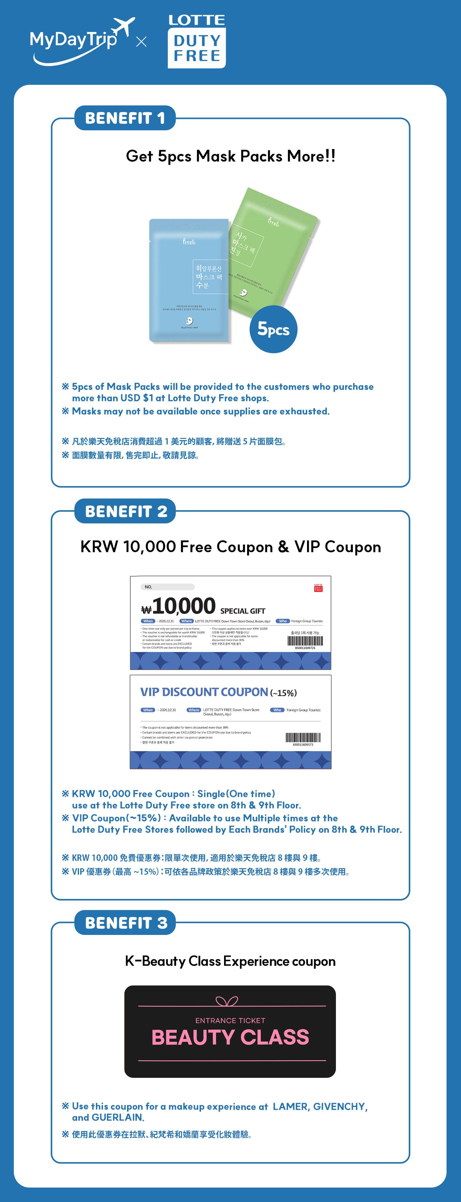 到樂天免稅店體驗特惠,包括KRW10000禮券、VIP優惠券和10只免費口罩。