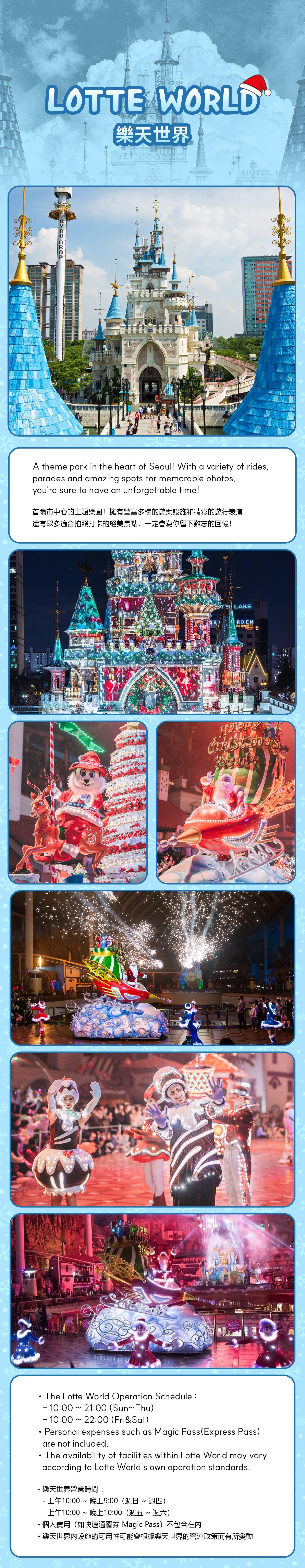 在樂天世界乘坐遊樂設施,參觀魔法島,度過美好的時光吧。 (第2屆參加者可使用4小時樂天世界)