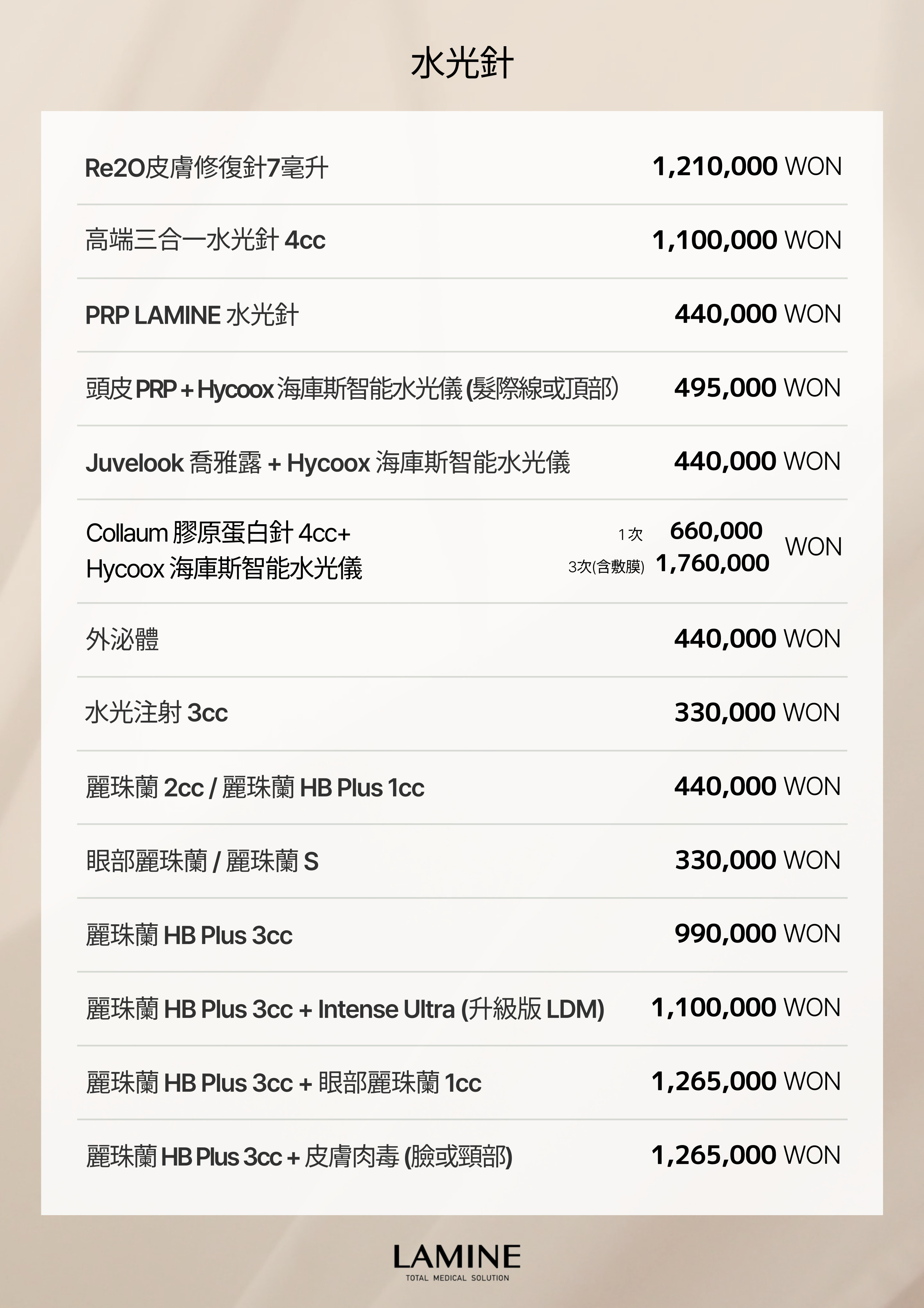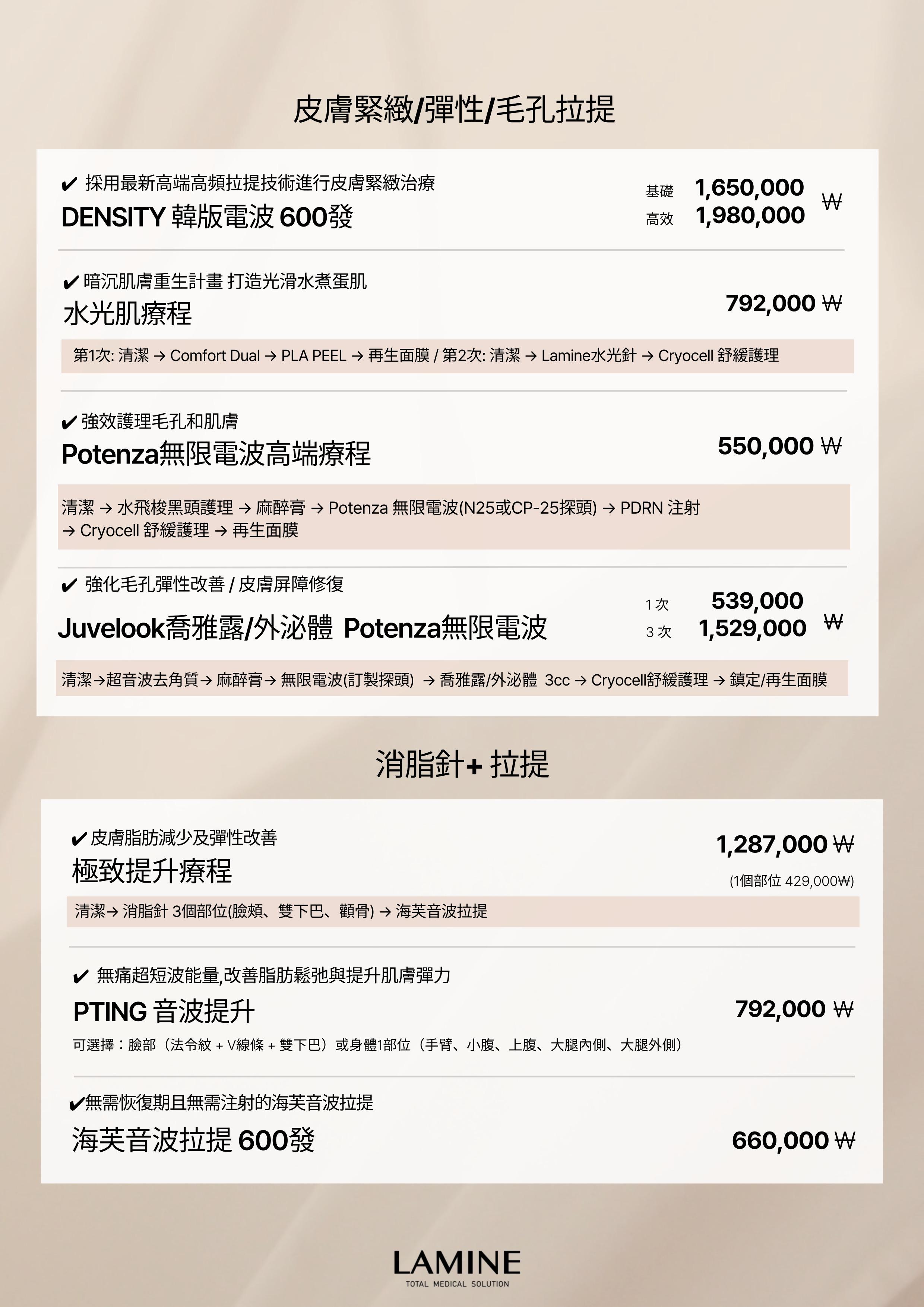 療程程序 | 院長諮詢→潔面 →麻醉膏→水光針1cc→鎮靜軟膜→護膚 |