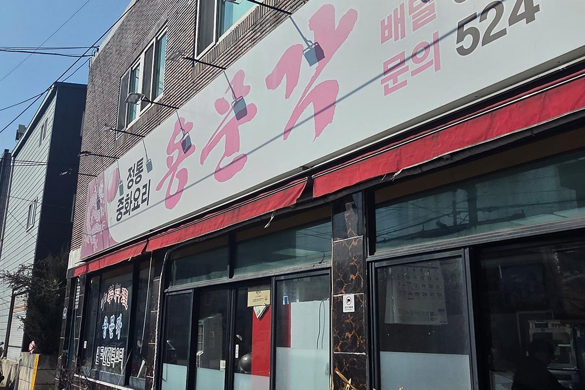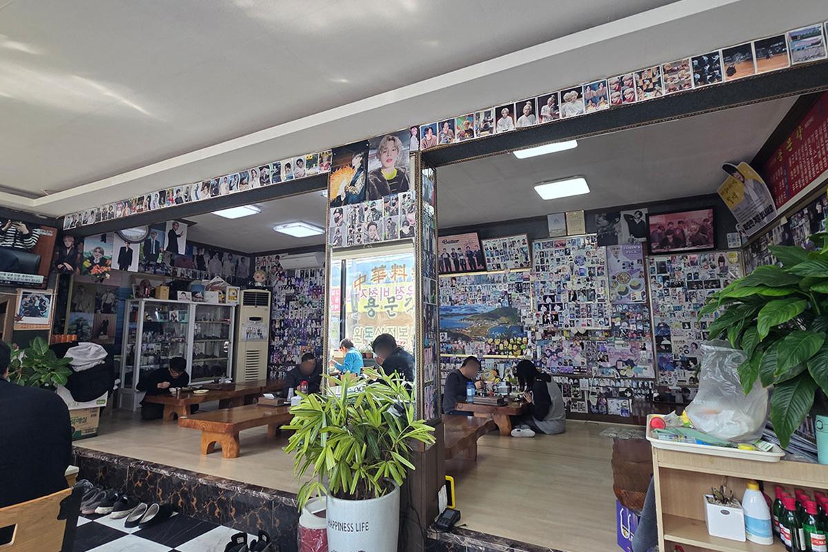 Restaurant interior in Busan with low wooden tables, walls covered in BTS photos and fans eating on the floor