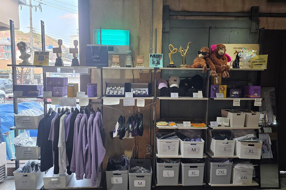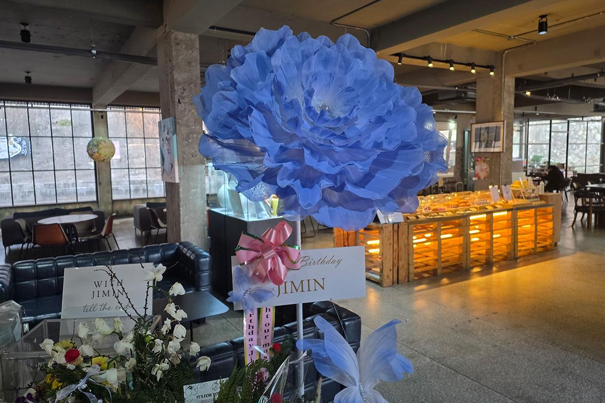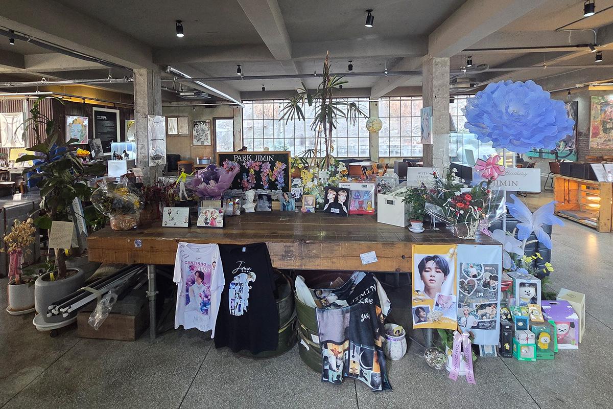 Indoor shrine table filled with Park Jimin fan gifts: flowers, photos, banners, shirts and memorabilia in a cafe-like space