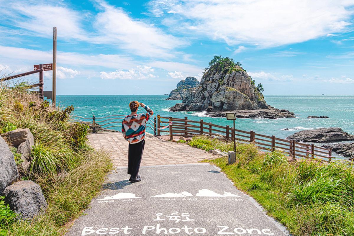 young person standing at coastal viewpoint labeled "Best Photo Zone" looking toward rocky islet and turquoise sea under blue sky