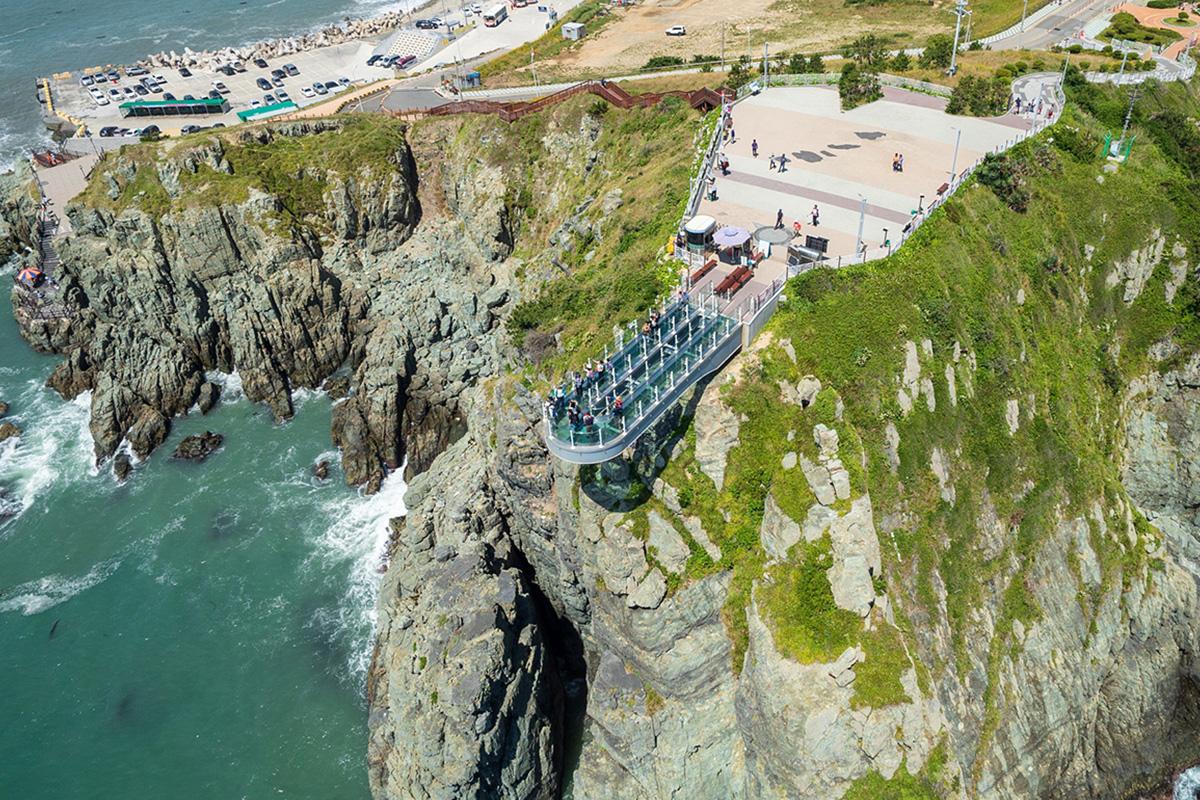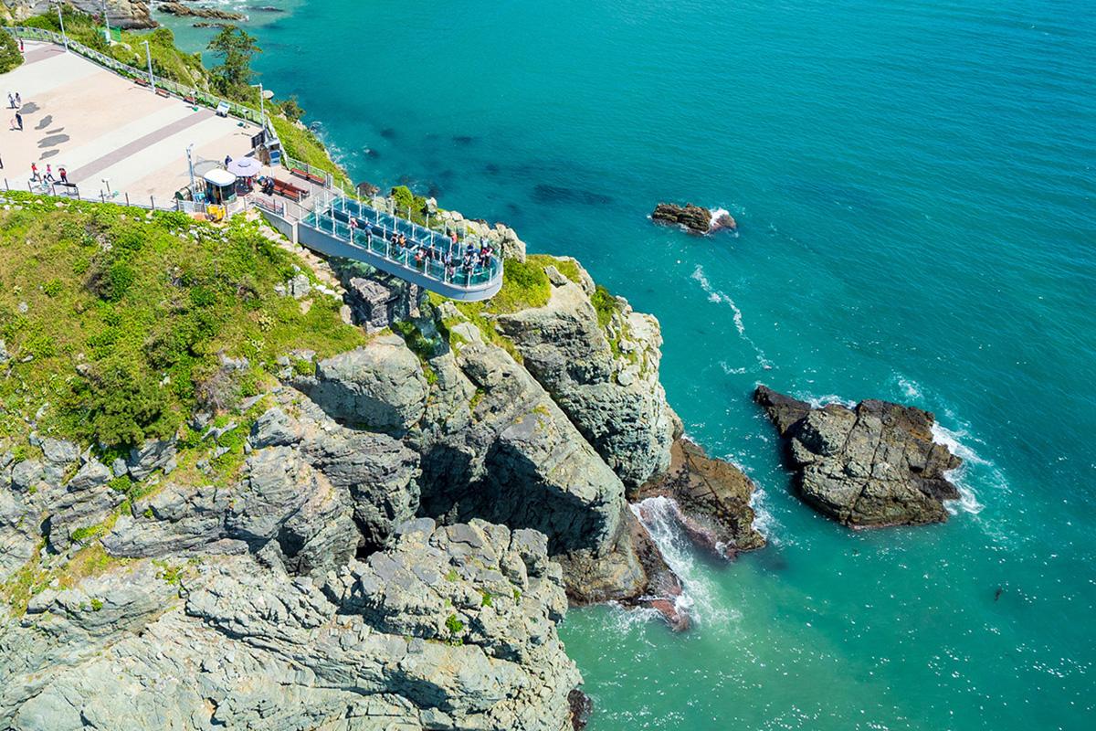 clifftop glass observation deck with visitors overlooking turquoise sea and rocky shoreline in Busan pilgrimage tour spot