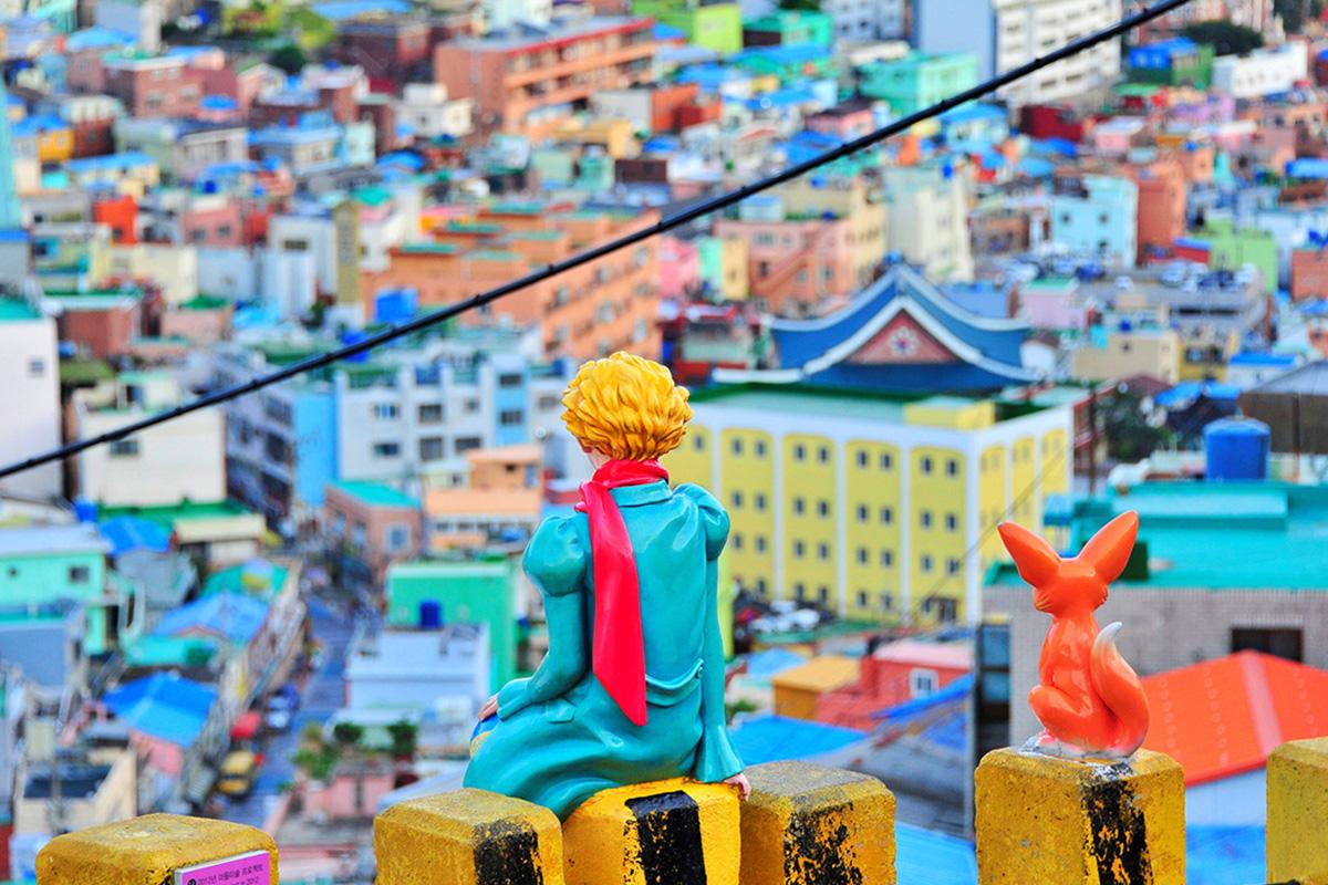 small statue of The Little Prince with red scarf and a fox figurine overlooking colorful hillside Busan neighborhood buildings
