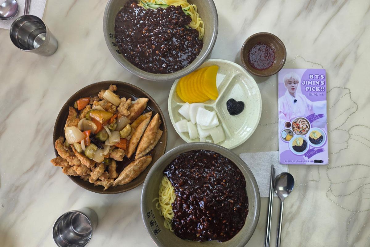 two bowls of jajangmyeon with black bean sauce, fried sweet-and-sour chicken, pickled radish and onions, and BTS-themed pamphlet on marble table