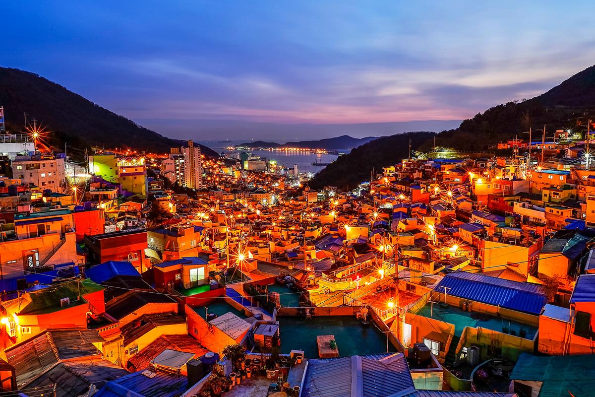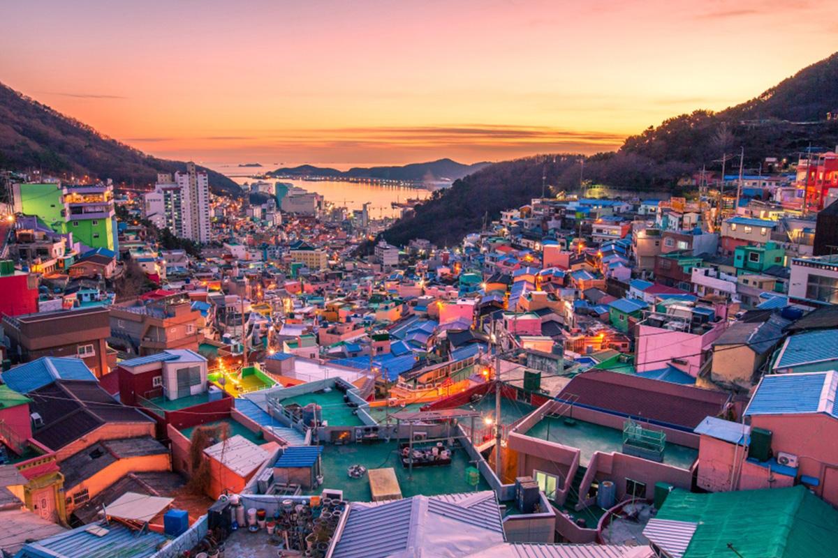 colorful hillside neighborhood in Busan at sunset with densely packed houses and distant harbor bay