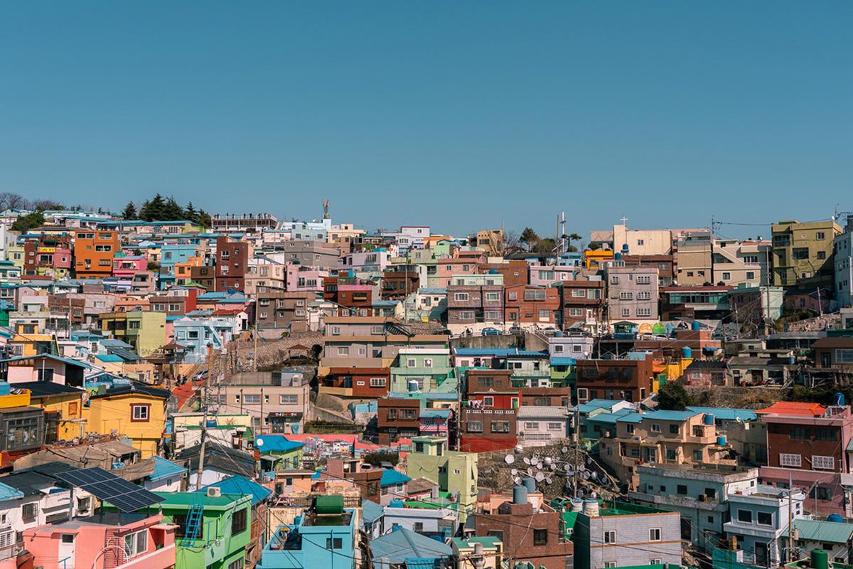 colorful hillside neighborhood in Busan with tightly packed pastel houses under a clear blue sky