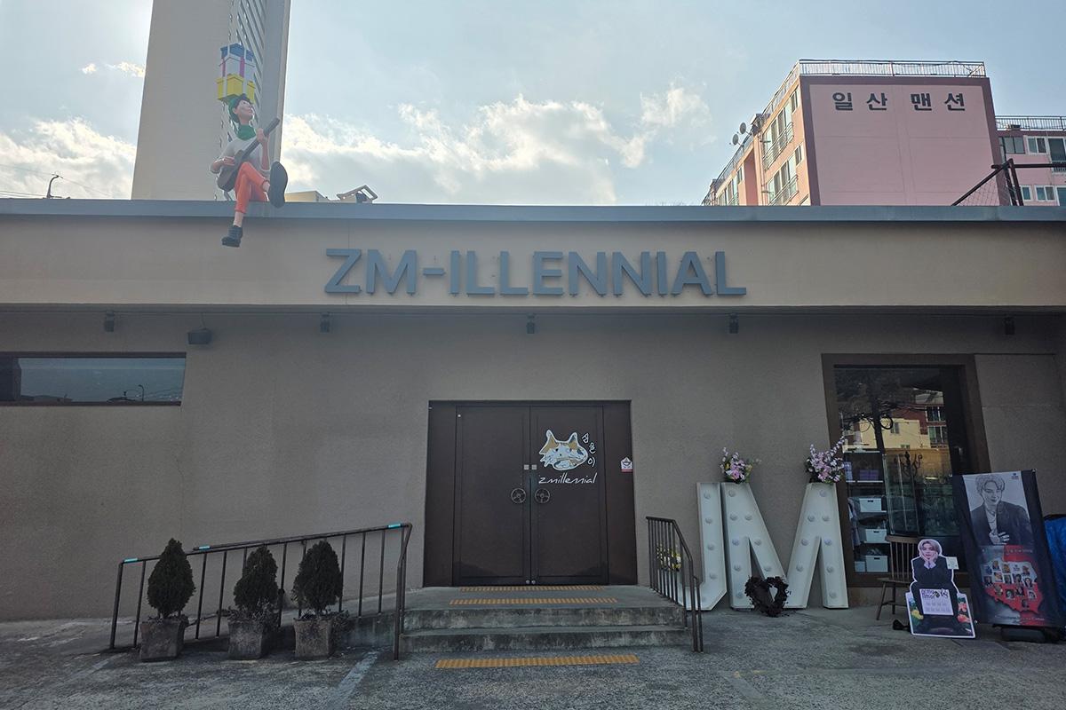 ZM-ILLENNIAL building facade with double doors, large marquee 'M' lights, fan-made cardboard cutouts and potted shrubs
