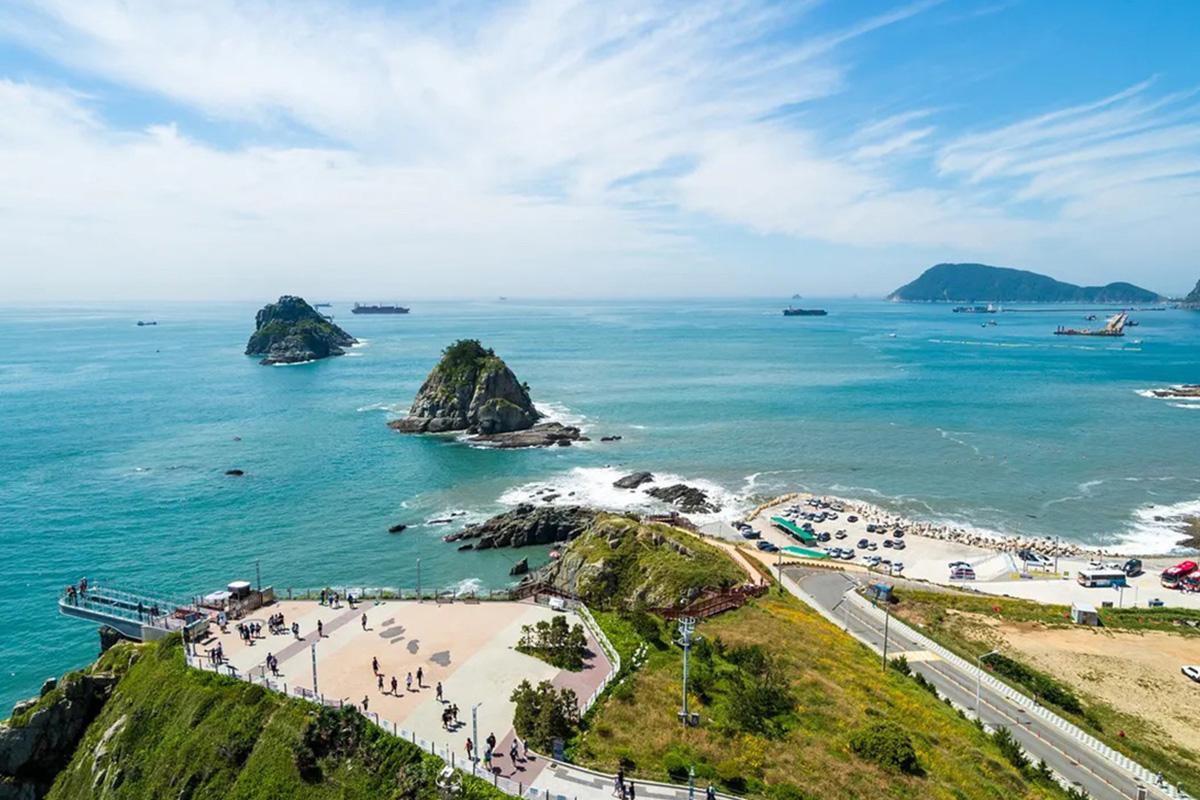 Busan coastal viewpoint with crowds on a cliff terrace overlooking turquoise sea, rocky islets and a sandy parking beach below