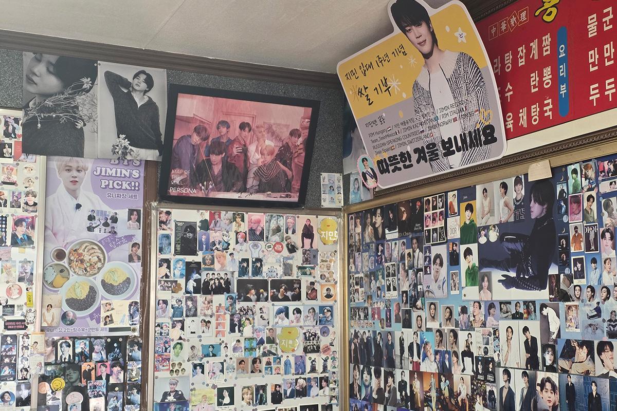 wall covered with hundreds of BTS photo cards, posters, and fan images inside a Busan ARMY-themed restaurant corner