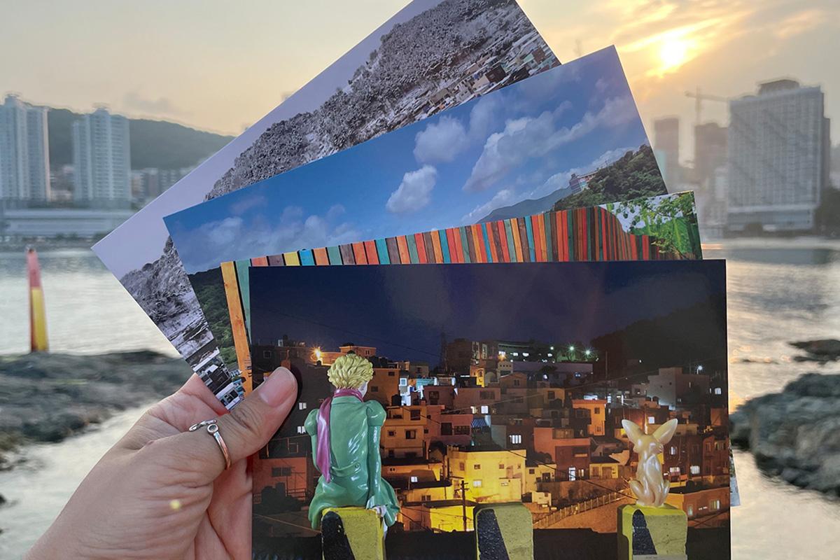 Hand holding colorful postcards showing Busan village nightscape and hillside scenes with sunset waterfront and city skyline behind.