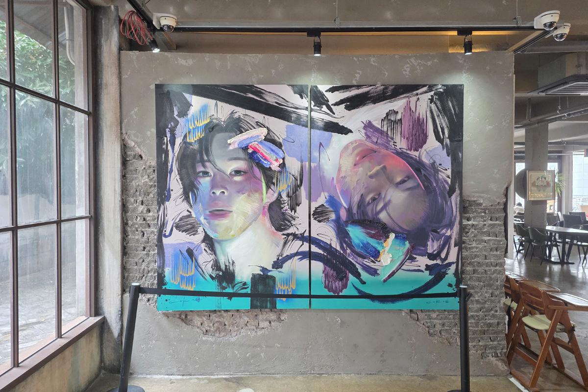 large colorful diptych mural with abstract brushstrokes and two faint faces mounted on exposed concrete wall inside cafe space