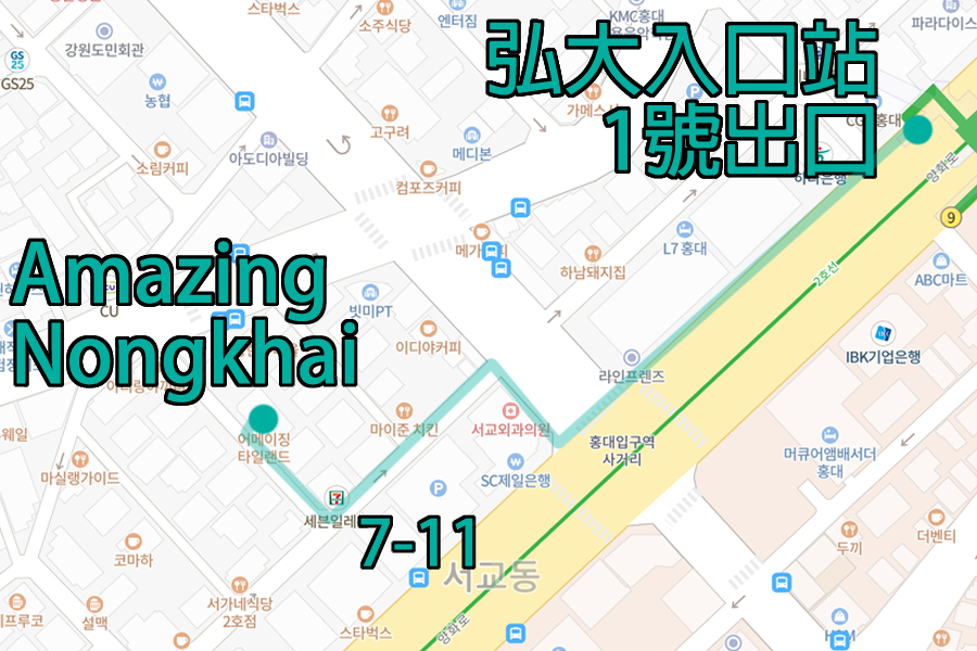 - 小撇步:弘大入口站(홍대입구역)1號出口出來,步行至大路口後過馬路、右轉,於第一個巷口左轉後看到7-11後,在7-11巷子彎進去就會看到Amazing Nongkhai。