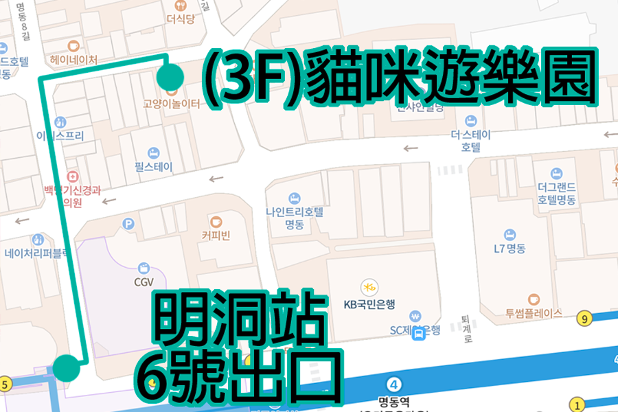 - 小撇步:首爾地鐵4號線明洞站(명동역)6號出口出來後往左邊走,第二個路口處右轉,斜前方會看到招牌,上去3樓即可抵達貓咪遊樂園(詳細路線圖參考文末)。