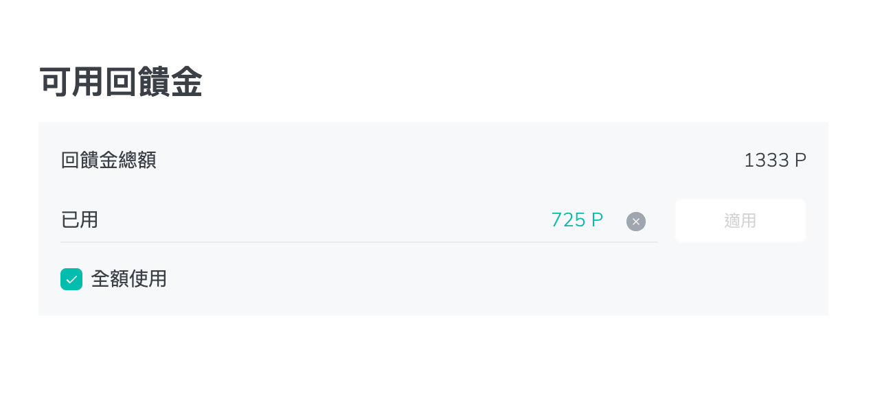 答:沒有,若持有回饋金金額大於預約金額,亦可全額支付(並以0元結帳),無相關%數或折抵上限。