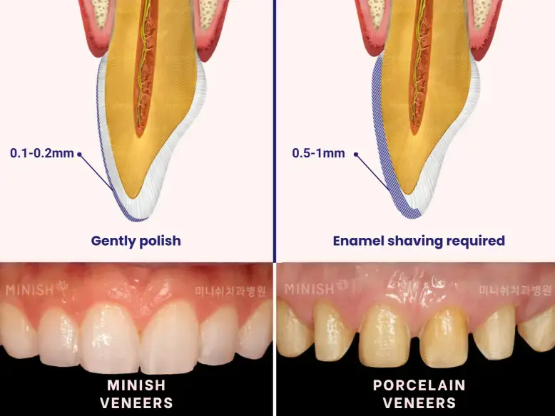 MINISH是一種韓國獨創的微創陶瓷貼片技術,強調極少修磨甚至無需修磨原牙,保護牙齒結構。