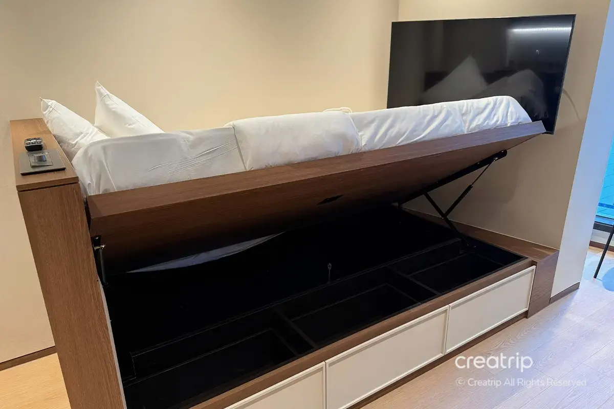 而且所有房型的床都具備升降收納(Lift-up)功能,收納力非常出色,即便是長期入住的旅客,約一年的行李量也能輕鬆收納,提供十分充裕的置物空間。