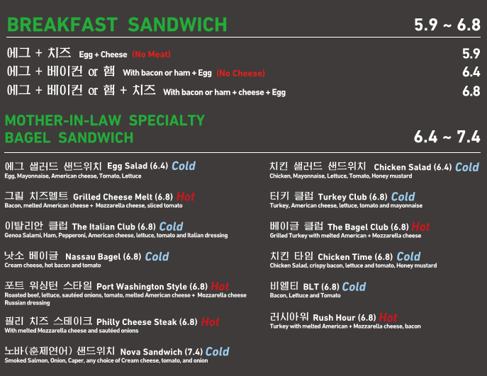 | 煙燻鮭魚三明治 노바(훈제연어) 샌드위치 | ₩7,400 |