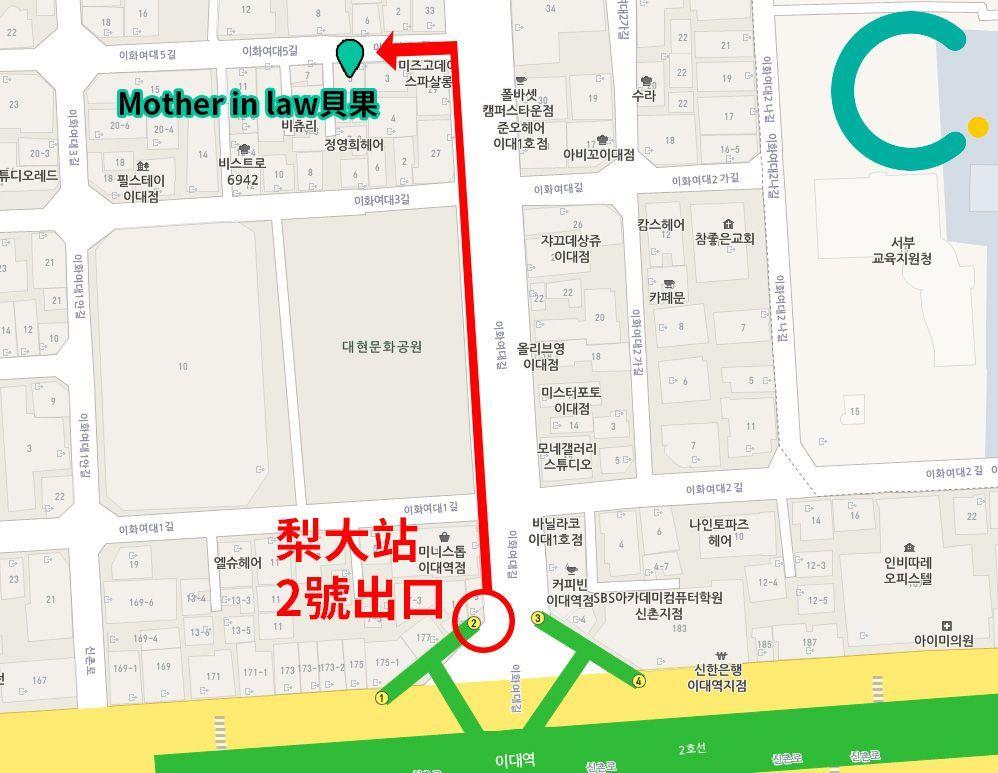 - 小撇步:從梨大站2號出口出來後,往前走140m左右。之後會看到左邊有一家服飾店「Rainbow(레인보우)」,從旁邊的路左轉進去,然後再走50m左右就可以看到Mother in Law貝果在左手邊。