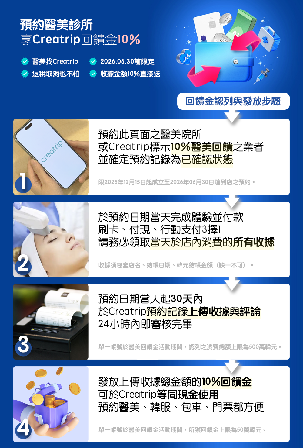 以超高匯率購買回饋金後,再搭配「優惠大禮包」,可獲得3張旅遊行程9折優惠券、SIM卡與eSIM85折券、餐廳訂位、住宿與旅遊保險也有折扣,花8800就立享至多100000優惠。結帳時套用優惠券打完折,記得再用此頁面購入的回饋金,省上再加省。[스팟] 立省10萬韓元🎉Creatrip韓國優惠券大禮包