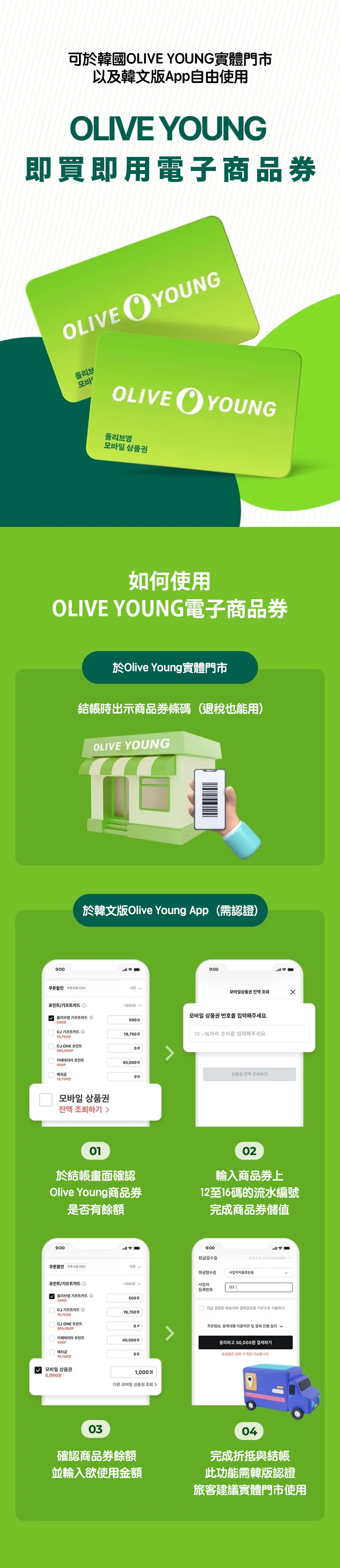 💡 於Olive Young現場門市消費時,旅客持護照滿₩15,000即可退稅(退稅時結帳也能使用此電子商品券支付)。門市出示Olive Young電子商品券,等同現金,可以即買即用,流程簡單,外國旅客也能輕鬆入手。全韓國多數Olive Young門市與韓文版App皆可使用,旅途中臨時需要保養品或日用品也能馬上入手。熱門K‑Beauty品牌與新趨勢一站買齊,涵蓋保養、彩妝、髮品、保健食品、生活用品;電子商品券根據金額自由選品,送禮實用又體面。