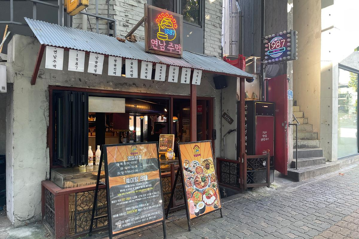 - 延南客栈1987结合80年代的复古与现代元素,并受到韩国知名节目《生放送Today(생방송투데이)》介绍,是个有当地小有知名的韩式餐酒馆。