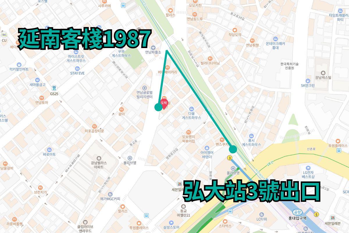 - 小撇步:首尔地铁2号线弘大入口站(홍대입구역)3号出口出来后直走,直行约200公尺遇到转角左转,直走约50公尺左手边即可抵达延南客栈1987(详细路线图参考文末)。