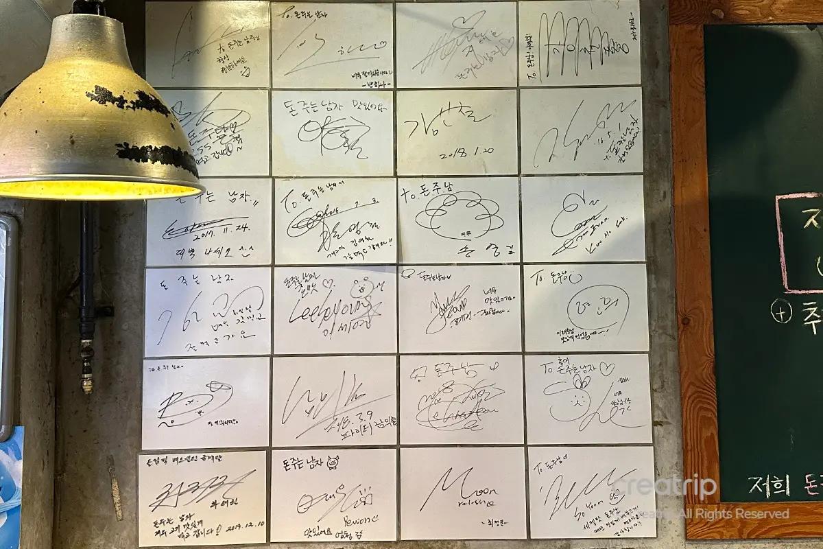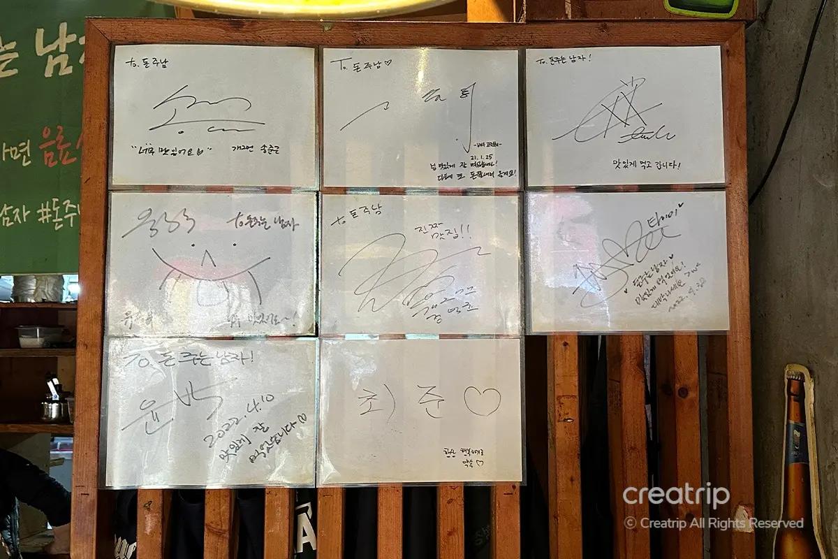 充满老店的氛围,内部空间也很宽敞,而且超多韩国艺人造访后的签名,更让人期待给豚的男人的滋味。