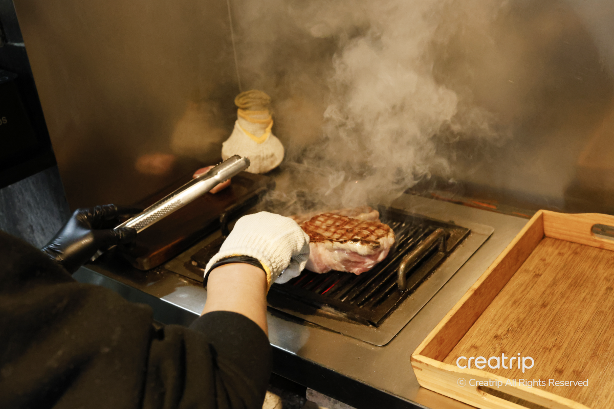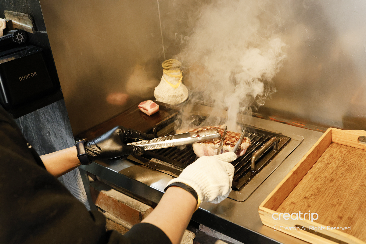 给豚的男人的肉品之所以能保留肉汁,同时带有熏香的秘密,就是在餐后,店员会亲自用炭火在烤架上先烤一遍肉,让猪肉表面带有一点炭香,再上桌进行第二次烘烤。