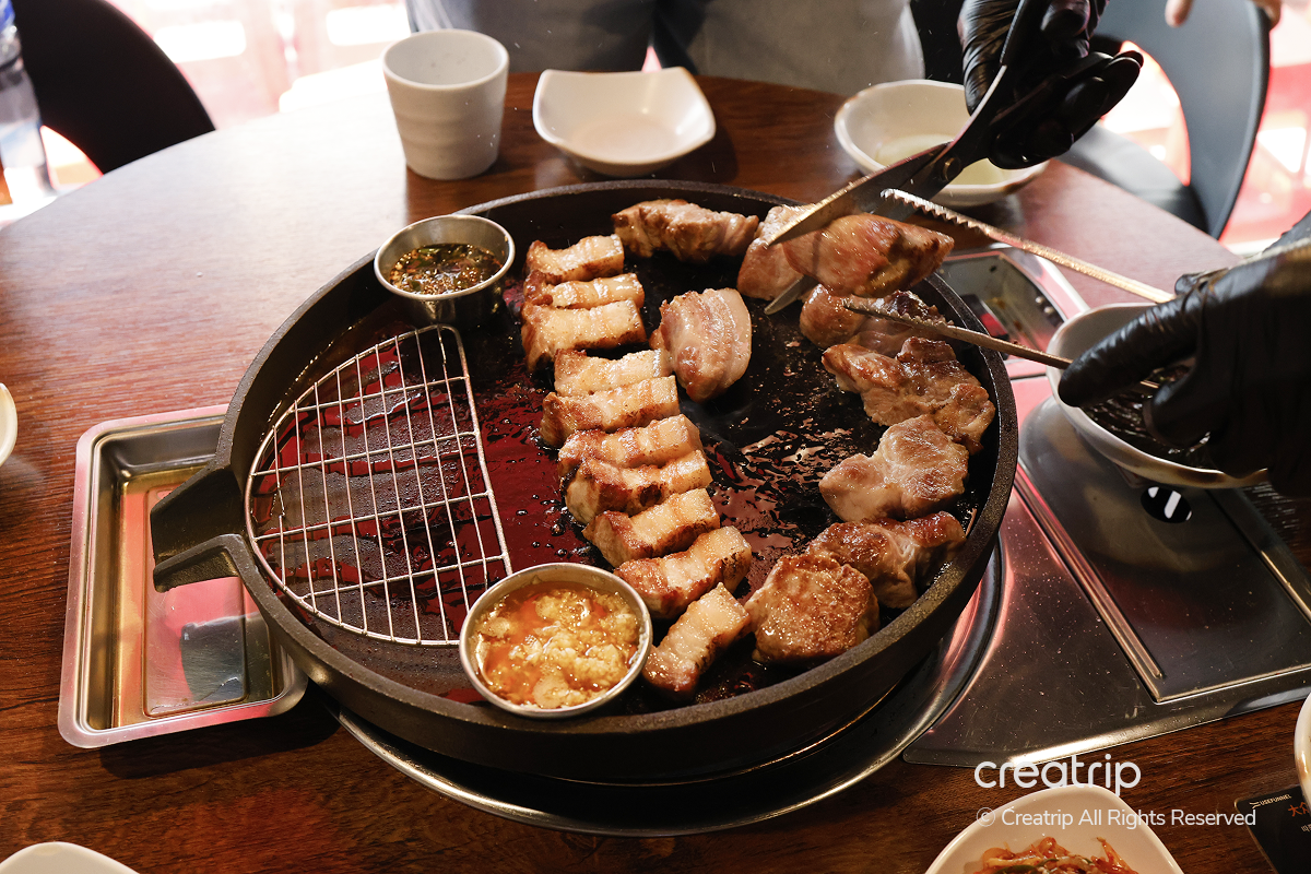 在弘大就能享受济州岛黑猪肉,不仅品质优良,三层肉多汁又鲜嫩,其他肉品如猪颈肉、松阪猪,甚至是店家2026年新上市的马场洞韩牛,都超级新鲜而且物超所值。这样的排队名店,你还不赶快收藏起来吗?