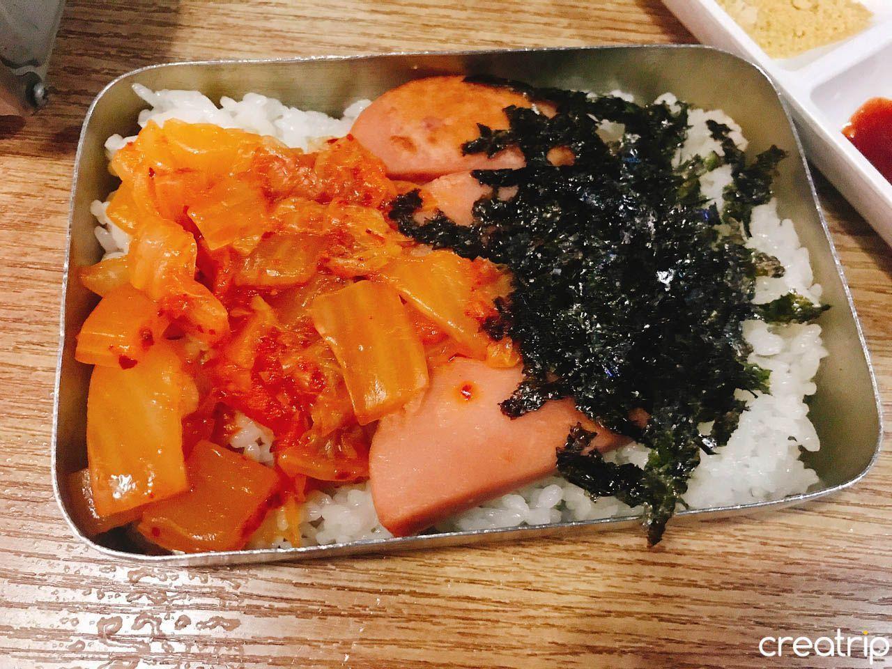 古早味饭盒由火腿、泡菜、蛋还有白饭组成,是以前人们的小吃。
