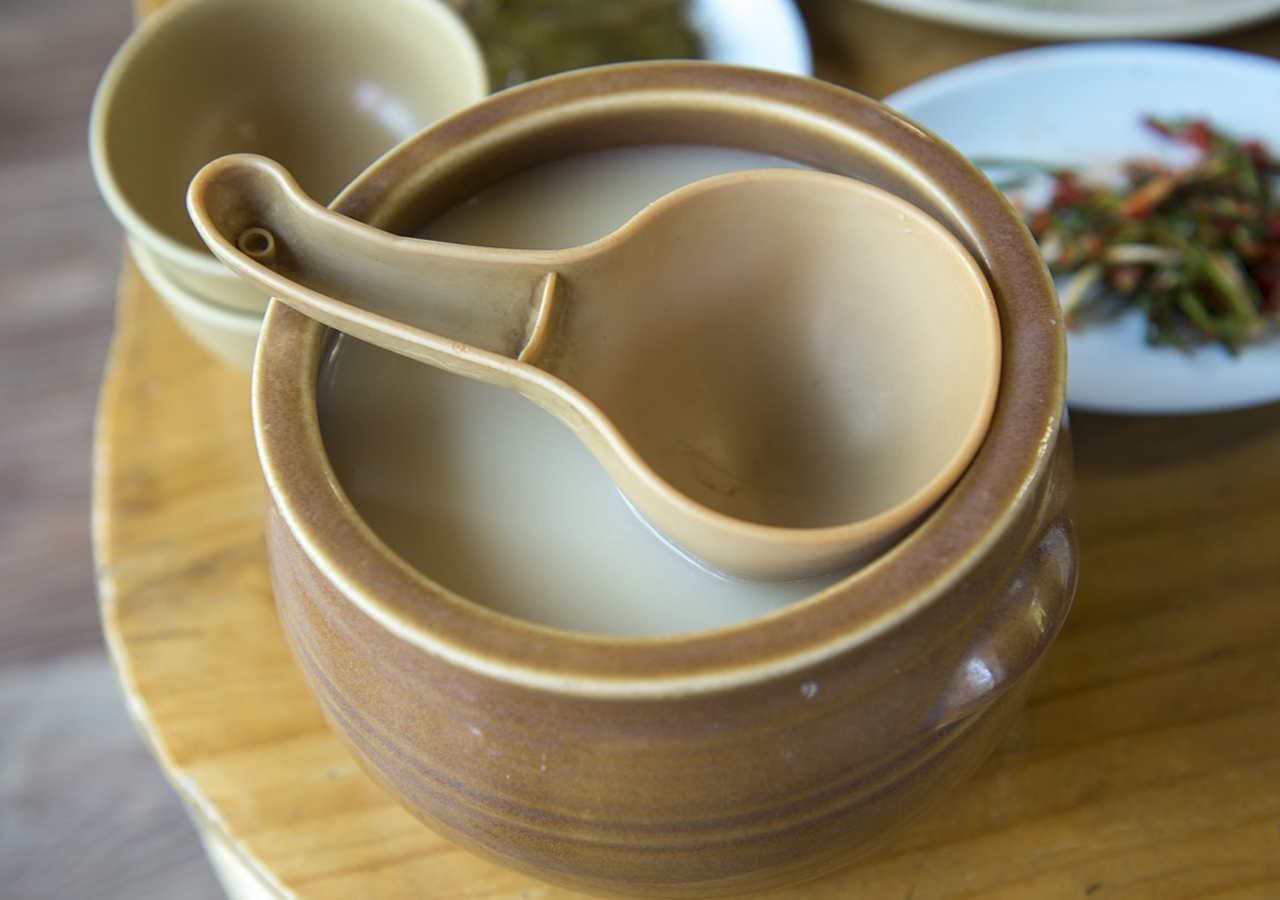 而除了煎饼配马格利之外,平时吃一些传统的韩国食物,比起烧酒或啤酒,这类用著小瓮装,并以铁碗当杯子喝的米酒,如此组合才更为痛快呢。