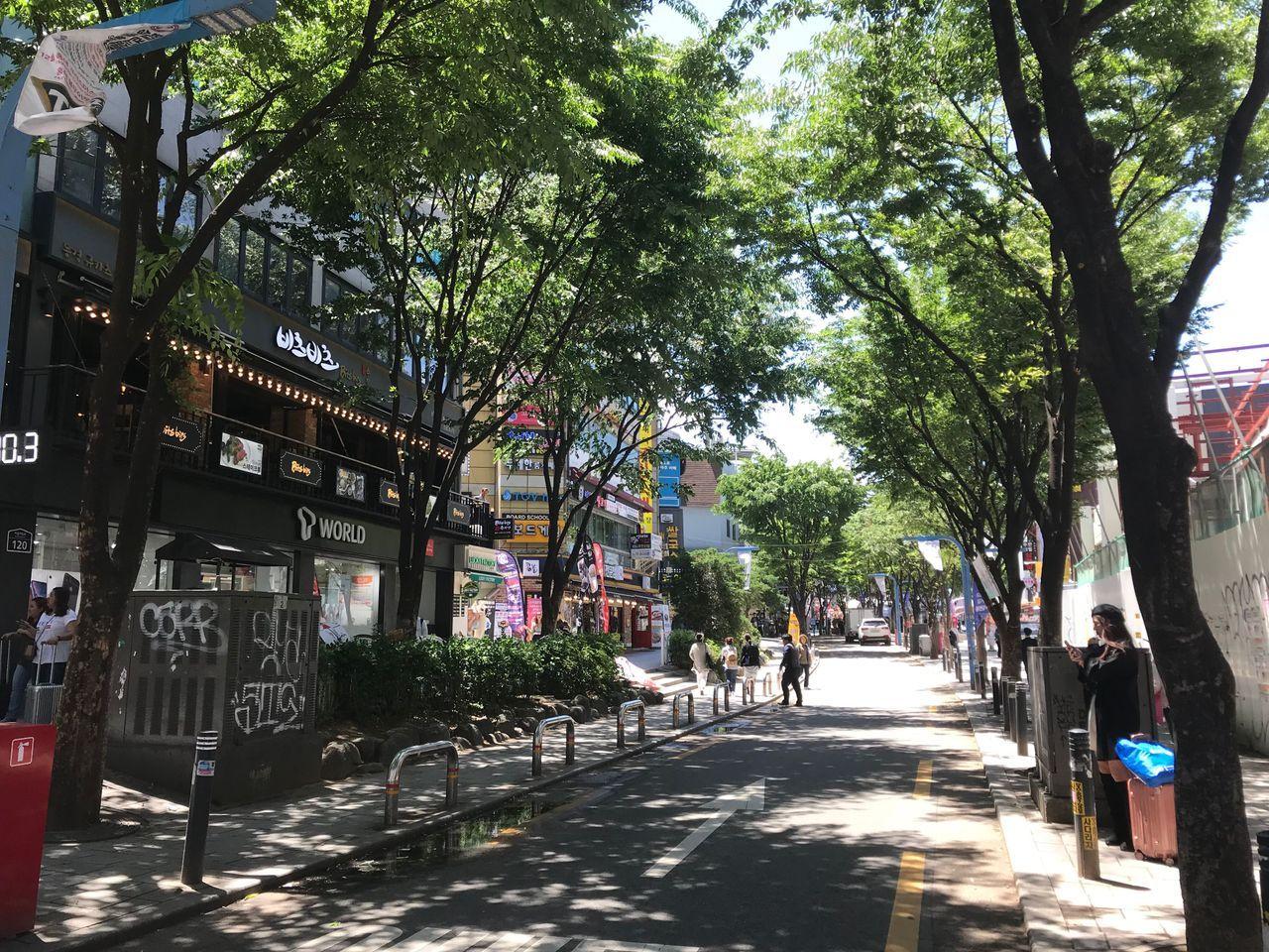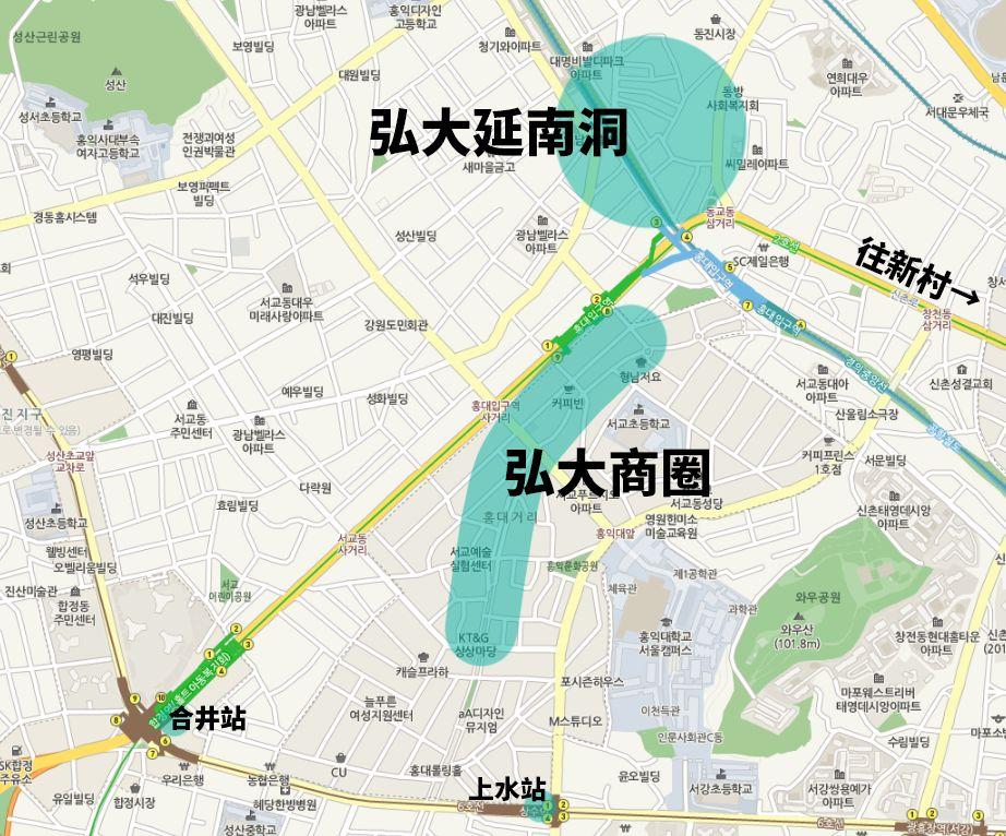 弘大站的8号、9号出口出来这一带,向前走就是最主要的弘大购物商圈,但要说得更广泛,也包含了周围邻近地铁合井站(합정역)、上水站(상수역)、延南洞(연남동)周边。
