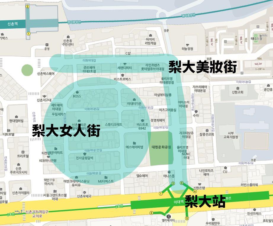 梨大站2号出口、3号出口出来,往前看的就是梨大美妆街,这里聚集了许多知名品牌美妆,是许多人在梨大购物,一定会扫货的地方。