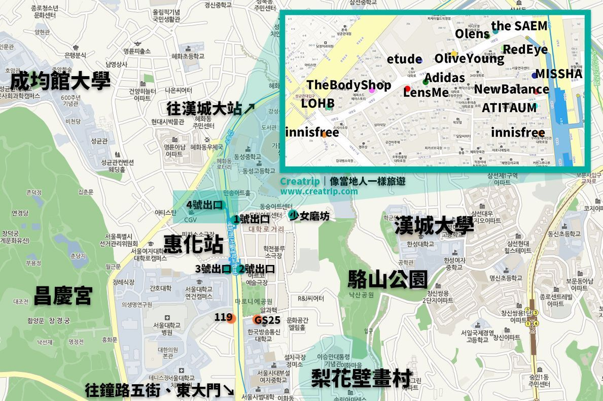 因为惠化大学路这有非常多剧场表演,让这里弥漫着文青气息。同时,美食、购物更是不从少过,成均馆大商圈自成一格地变成很热门的在地景点。